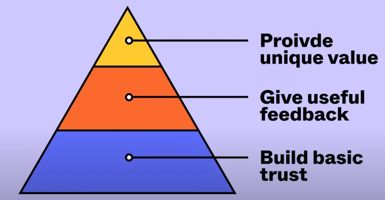 For giving useful feedback, this often relates to providing feedback on a design, and here I like the tip to zoom out instead of zooming in. It is easy to jump straight to minor details or edge cases without considering the main considerations for the design. The picture illustrates these points, from low-level details to a higher level.