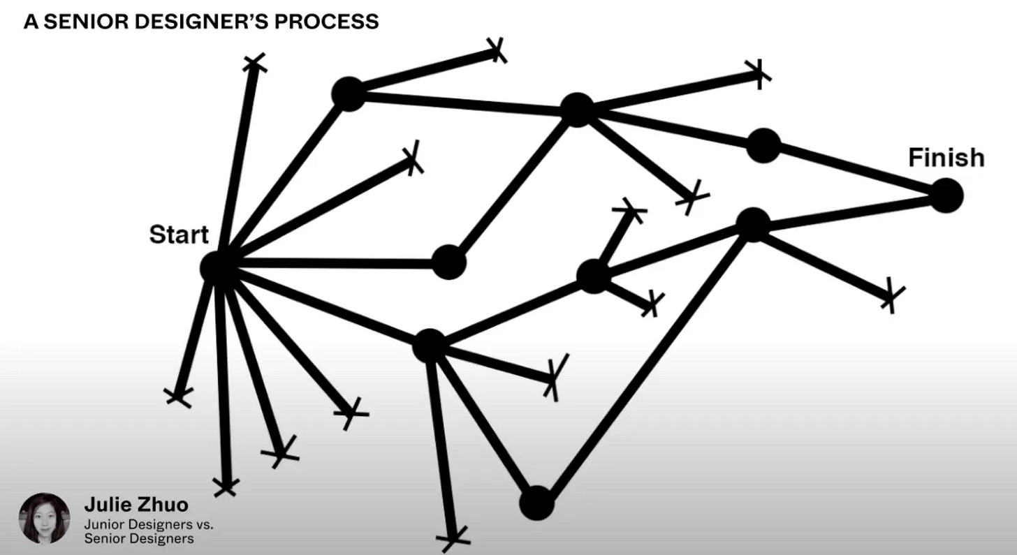 For the last part, while a design is a solution, often the most value is achieved by better defining and understanding the problem and aligning on it. Doing this properly makes it easier for the designer to take a more articulated approach to exploring the solution space, where different approaches and tests can be more deliberate from the start, as visualized in the picture below.